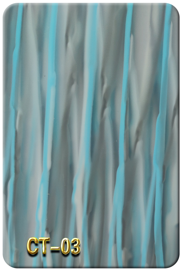 表面高亮光滑,絕無異物; 耐候性、耐溫性好,使用壽命長久,不會褪色失光; 加工后性能穩定,無異味;適合機械加工又易熱成型。 無毒、綠色環保,外觀優美,品種繁多、色彩鮮艷 層次分明